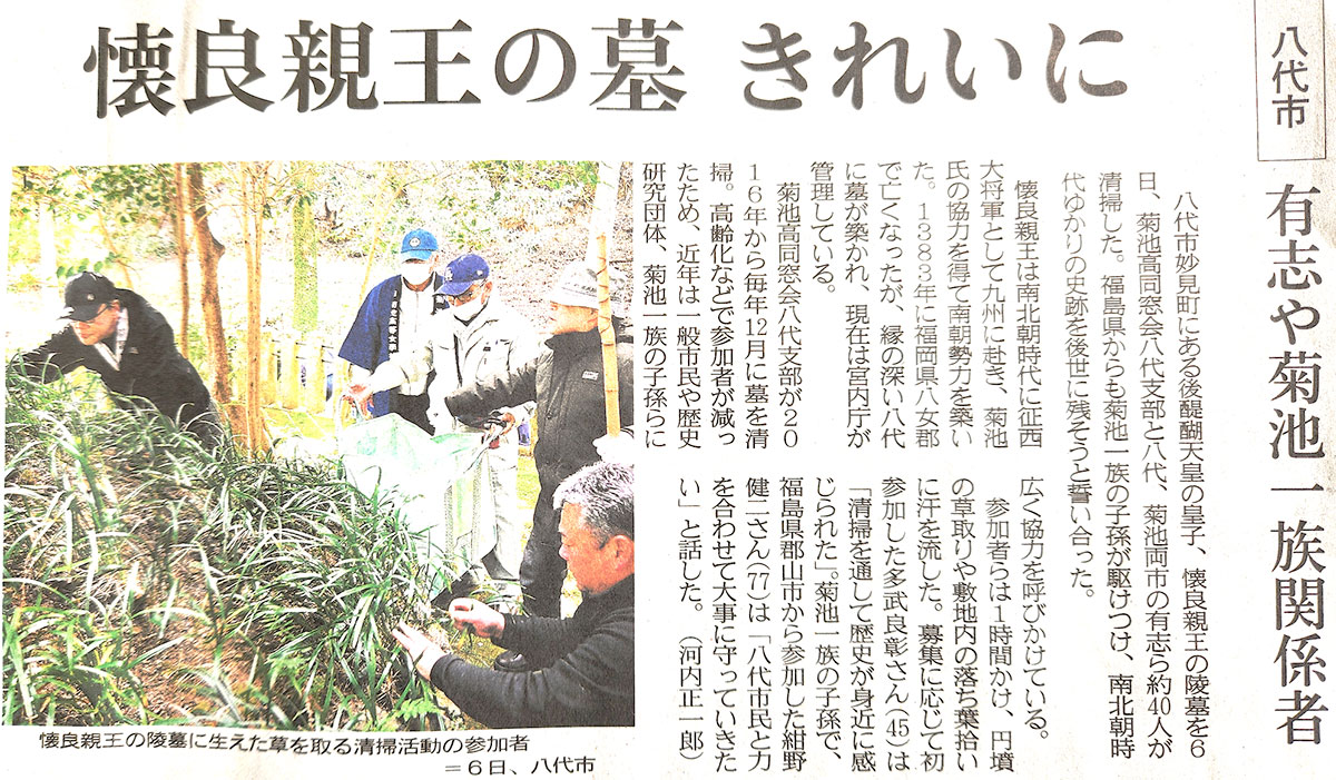菊朋会(熊本県立菊池高校同窓会)八代支部では、懐良親王を支えた武将・菊池一族ゆかりの縁から、菊朋会八代支部の会員を中心に、墓守(宮内庁嘱託員)の方や地元ボランティアと協力して毎年12月に清掃活動を行われています。